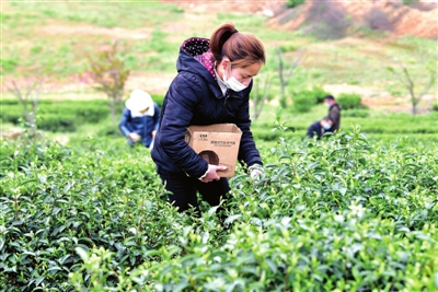 據(jù)了解,該基地由在外創(chuàng)業(yè)回鄉(xiāng)人員于2015年興建,占地500余畝,目前已逐步成園?;刈?月6日復(fù)工以來,日平吸納當(dāng)?shù)貏趧恿?0余人次采茶。