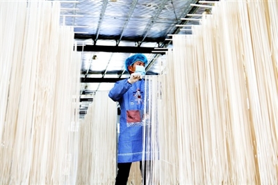 村民在沙堆鎮(zhèn)石沖村扶貧車間生產(chǎn)葛根面條