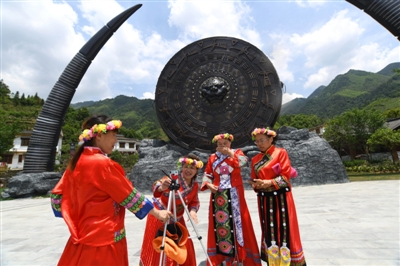 11日,通城縣大坪鄉(xiāng)內沖瑤族村瑤望千年廣場,游客身著鮮艷服裝,開始錄制抖音。