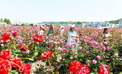 通城縣麥?zhǔn)墟?zhèn)冷段村引進(jìn)資金,在200余畝荒地上種植月季花。20多個品種的月季正值盛花期,每天吸引眾多游客游玩賞花,當(dāng)?shù)匕才?0多位農(nóng)民配套服務(wù),在家門口增收。