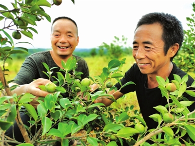 9月10日,崇陽縣石城鎮(zhèn)漢興村村民楊四雄(右)在油茶基地查看油茶長勢(shì)。
