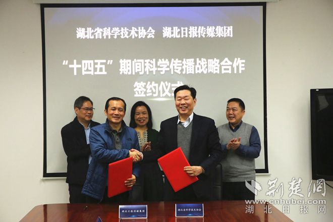 荊楚網(wǎng)客戶端—荊楚網(wǎng)消息(記者謝頤、陳雅俊 通訊員安明山)普及科學(xué)知識(shí),倡導(dǎo)科學(xué)方法,傳播科學(xué)思想,弘揚(yáng)科學(xué)精神。1月27日,湖北省科學(xué)技術(shù)協(xié)會(huì)與湖北日?qǐng)?bào)傳媒集團(tuán)簽訂“十四五”期間科學(xué)傳播戰(zhàn)略合作協(xié)議。協(xié)議明確:雙方聚焦主責(zé)主業(yè),充分發(fā)揮各自優(yōu)勢(shì),推進(jìn)“十四五”期間全面深入合作,增強(qiáng)科學(xué)傳播的影響力和覆蓋面,為實(shí)現(xiàn)湖北省2025年公民科學(xué)素質(zhì)建設(shè)目標(biāo)提供有力支撐。