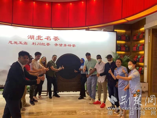 圖為在重達100多斤的赤壁青磚茶工藝品擺件前,國際友人一起合影留念。(通訊員供圖)
