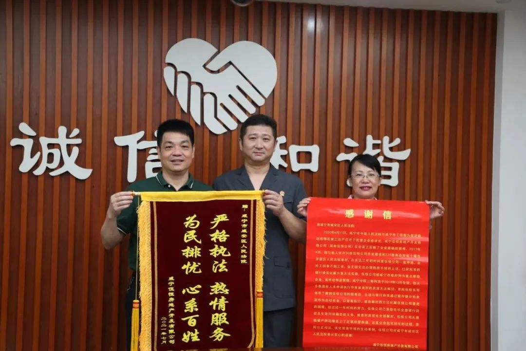 “感謝咸安區(qū)法院,讓我們公司從瀕臨破產(chǎn)的邊緣走回正常經(jīng)營(yíng)的軌道,幫助我們起死回生......”7月16日下午,咸寧伍恒房地產(chǎn)開發(fā)有限公司(以下簡(jiǎn)稱伍恒公司)負(fù)責(zé)人將一面寫有“嚴(yán)格執(zhí)法,熱情服務(wù);為民排憂,心系百姓”的錦旗和一封感謝信送至咸安區(qū)法院,感謝區(qū)法院執(zhí)行局善意文明執(zhí)行,幫助企業(yè)渡過難關(guān)。