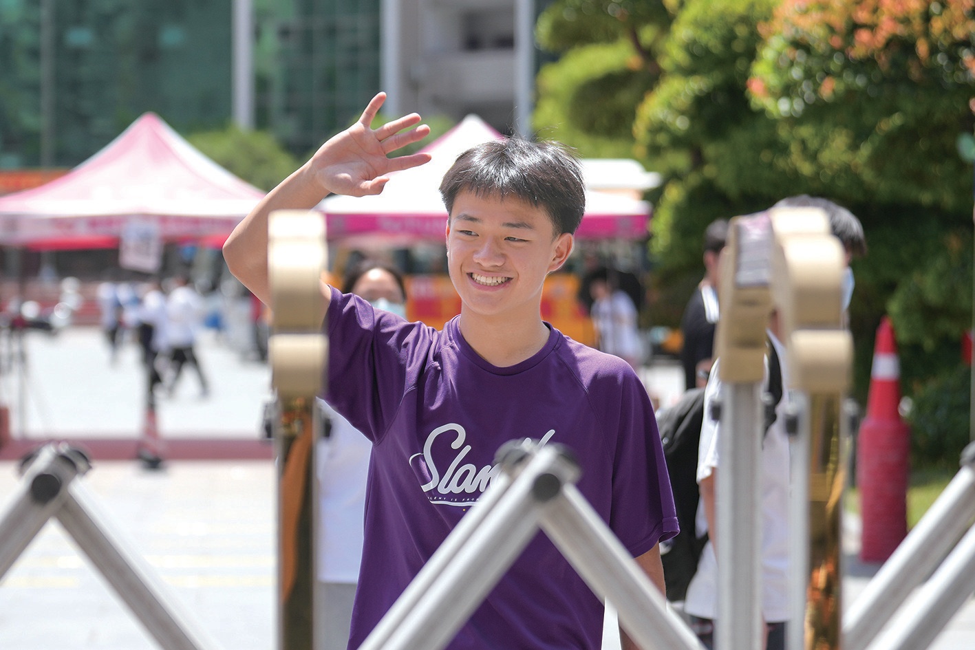考點(diǎn)里,學(xué)生們有序排隊(duì)、測溫、驗(yàn)證,依次進(jìn)入考場;考點(diǎn)外,一條警戒線將老師、家長們隔離在外。盡管天氣炎熱,老師和家長們還是守在校門口,滿懷希望的目光始終跟隨著孩子。
