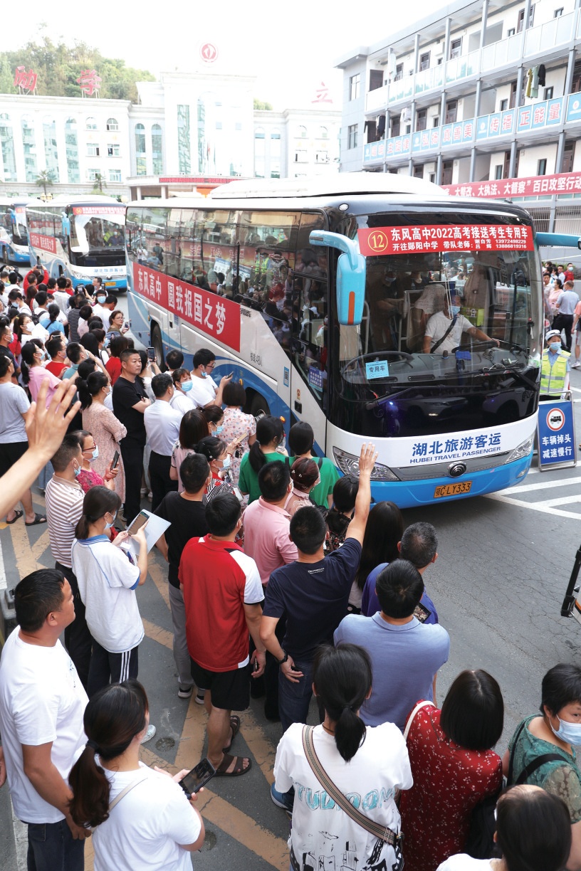 東風(fēng)高中的“少年戰(zhàn)士”踏上高考的征程。車身上的標(biāo)語“圓我報(bào)國之夢”為孩子們的夢想做了最好注解。