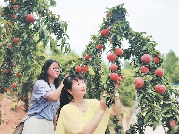 6月8日,游客在丹江口市均縣鎮(zhèn)均州蜜桃采摘園采摘蜜桃。眼下,正值蜜桃成熟期,該園吸引了不少游客前來采摘。據(jù)了解,2019年4月,原鄉(xiāng)人張慶華投資400多萬元成立丹江口市億園果樹種植專業(yè)合作社,在當(dāng)?shù)亓鬓D(zhuǎn)200余畝荒地種植蜜桃,今年可采摘蜜桃25萬公斤,收入200余萬元,帶動70余名農(nóng)戶平均增收6000元。記者李平攝