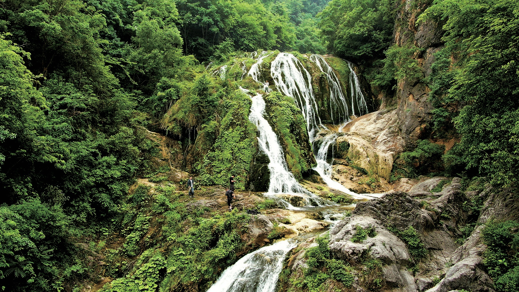 順著溪流下行半個(gè)多小時(shí),一條十幾米寬的激流被陡峭山崖阻擋后形成無(wú)數(shù)分支,從約20米高的大型鈣化梯坎上跌落。這是該河段最為壯觀(guān)的一處瀑布,氣勢(shì)磅礴,聲聞十里,如戰(zhàn)鼓擂動(dòng)、萬(wàn)馬奔騰。