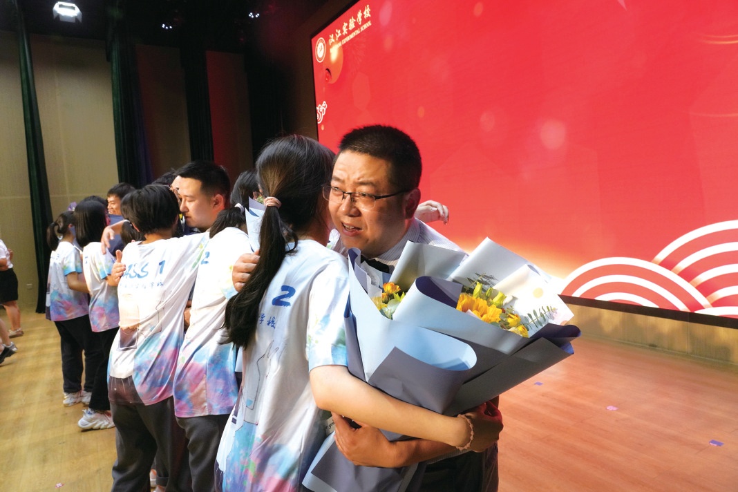 6月17日,漢江實(shí)驗(yàn)學(xué)校舉行“傳承榮光·感恩母校”2022屆九年級(jí)畢業(yè)典禮,為即將參加中考的學(xué)子們加油鼓勁。圖為學(xué)生與老師擁抱,表達(dá)感激之情。圖/通訊員 涂銀玥 鮑玉