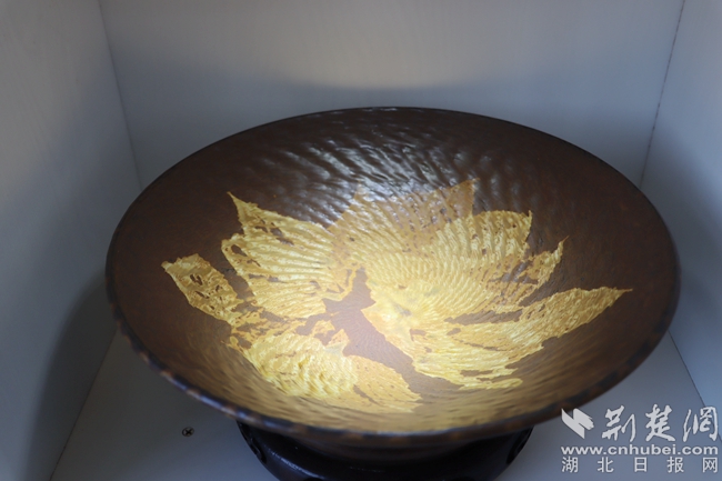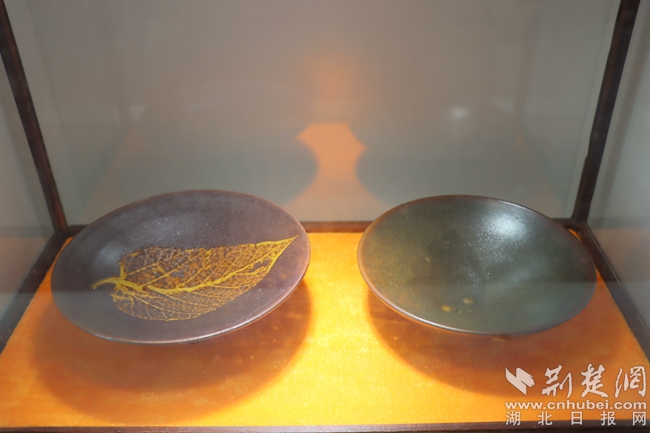 將天然樹葉燒制于盞上,盞里倒上水,盞內木葉莖脈清晰,或卷或舒,仿若在水中漂。在工作室,何登明向記者展示著他的得意之作——仿宋吉州窯木葉盞。