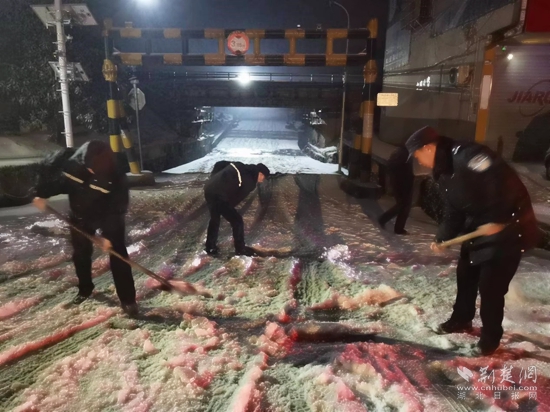 2月22日上午,在東洲橋路段掃雪現(xiàn)場,赤壁市建工集團工作人員正頂風冒雪手持鐵鍬、雪鏟等清掃工具,鏟除橋梁上的積雪,鋪設(shè)草毯防滑。