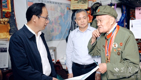 當(dāng)天上午,黃石市委宣傳部副部長(zhǎng)、市委網(wǎng)信辦主任萬(wàn)金光,黃石市退役軍人事務(wù)局黨組書(shū)記、局長(zhǎng)陳鵬圖一行參加啟動(dòng)儀式,并前往抗美援朝老戰(zhàn)士瞿介昌住處看望。他們向瞿介昌老戰(zhàn)士簡(jiǎn)單介紹了本次主題報(bào)道情況,向這位老英雄獻(xiàn)上了鮮花,表達(dá)了對(duì)退役軍人的敬意,并為“致敬英雄”采訪團(tuán)授旗。