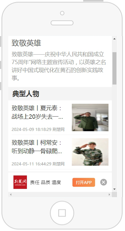 為向歷史開(kāi)掘精神資源,營(yíng)造崇尚英雄、學(xué)習(xí)英雄、關(guān)愛(ài)英雄的濃厚氛圍,黃石市委網(wǎng)信辦、市退役軍人事務(wù)局聯(lián)合荊楚網(wǎng)(湖北日?qǐng)?bào)網(wǎng))啟動(dòng)《致敬英雄》大型網(wǎng)絡(luò)專(zhuān)題宣傳。
