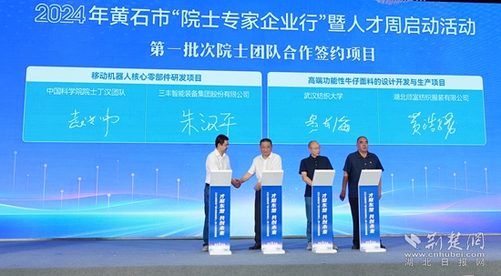 現(xiàn)場還舉行了項(xiàng)目簽約活動,簽約移動機(jī)器人核心零部件研發(fā)項(xiàng)目、高端功能性牛仔面料的設(shè)計開發(fā)與生產(chǎn)項(xiàng)目等2個院士專家合作項(xiàng)目、球墨鑄鐵管壁測量項(xiàng)目等10個人才合作項(xiàng)目以及4個人才服務(wù)合作項(xiàng)目,并為鄂東技師學(xué)院國家級高技能人才培訓(xùn)基地授牌。