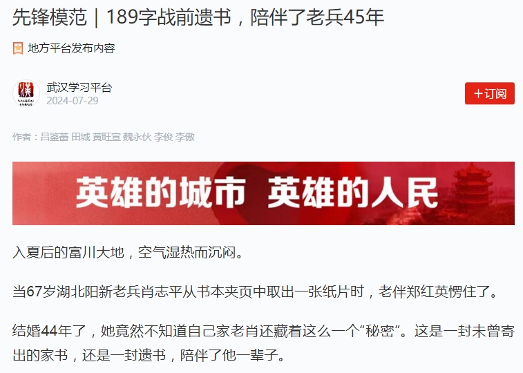 連日來(lái),《189字戰(zhàn)前遺書(shū),陪伴了老兵45年》的故事也在不斷升溫,獲得省內(nèi)外多家媒體密集關(guān)注。
