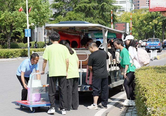 完成報(bào)到手續(xù)后,新學(xué)子們帶上行李,乘坐觀光車(chē)直達(dá)宿舍,同時(shí),也開(kāi)啟了他們的校園探索之旅。記者發(fā)現(xiàn),這些校車(chē)觀光車(chē)不僅外觀新穎、內(nèi)飾舒適,司機(jī)還饒有興致地為新學(xué)子們?cè)敿?xì)介紹校園的歷史沿革、建筑風(fēng)格、教學(xué)設(shè)施以及各個(gè)學(xué)院的特色。