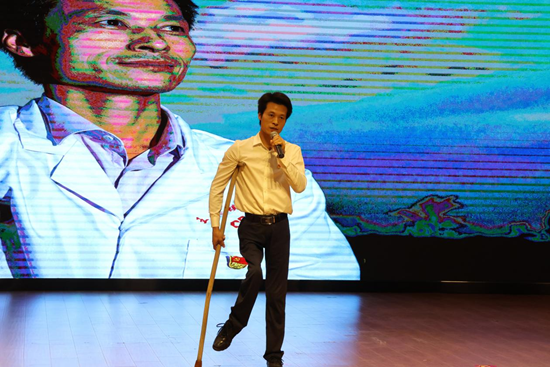 杜詠梅的《牽手》,講述了一位教師與一名自閉癥兒童的故事。“吾國萬疆以仁愛,千年不滅的信仰......”現(xiàn)場觀眾應節(jié)合拍,氣氛達到了高潮。