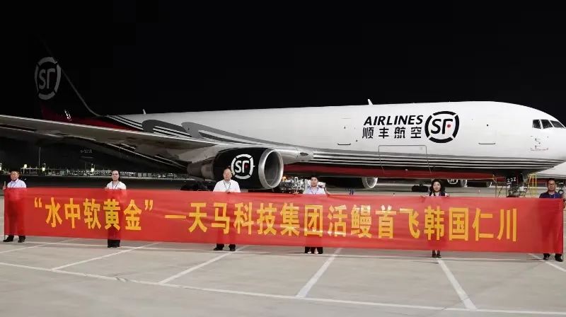 5月9日5時03分,一架載著來自天馬科技集團黃岡基地的182箱3700公斤活體鰻魚的順豐航空 O3141EHU-ICN貨運專機,從花湖機場飛往韓國仁川,7時17分順利抵達,8時02分韓國客戶已順利在仁川國際機場提貨。