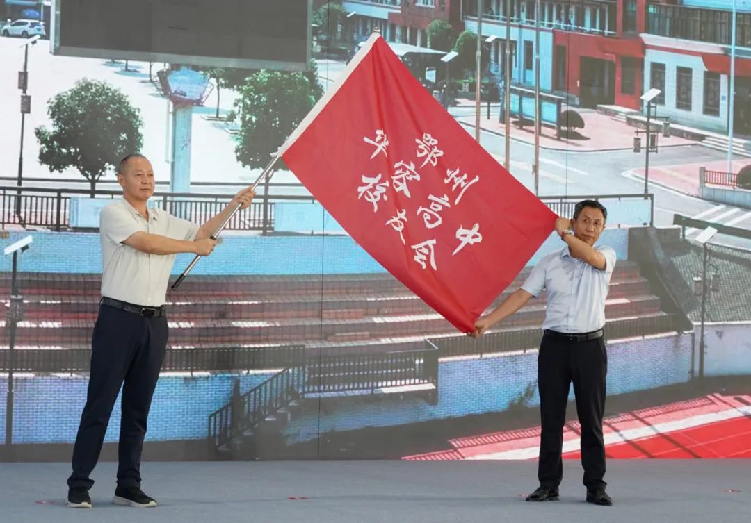 華容高中校長姜?jiǎng)亠w向校友代表授旗