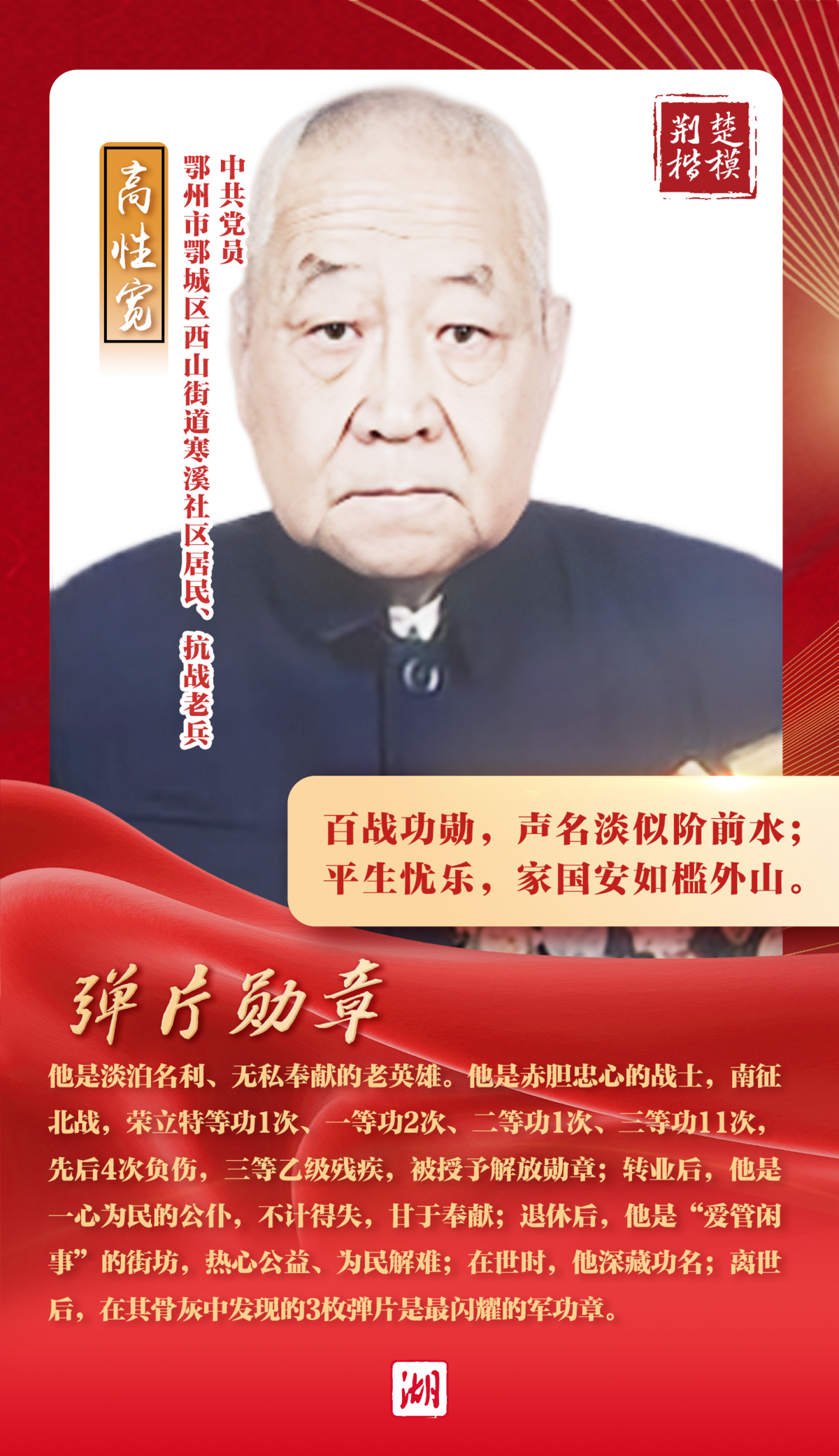 他是淡泊名利、無私奉獻的老英雄。他是赤膽忠心的戰(zhàn)士,南征北戰(zhàn),出生入死,榮立特等功1次、一等功2次、二等功1次、三等功11次,先后4次負傷,三等乙級殘疾,被授予解放勛章;轉業(yè)后,他是一心為民的公仆,不計得失,甘于奉獻;退休后,他是“愛管閑事”的街坊,熱心公益、為民解難。在世時,他深藏功名;離世后,其骨灰中發(fā)現(xiàn)的3枚彈片是最閃耀的軍功章。
