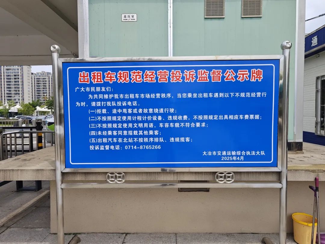 值得注意的是,今年7月,市交通運輸綜合執(zhí)法大隊在大冶北站出站口設(shè)置了出租車投訴點,旁有“出租車規(guī)范經(jīng)營投訴監(jiān)督公示牌”,明確拒載、不按規(guī)定使用計價設(shè)備等行為可在此投訴。