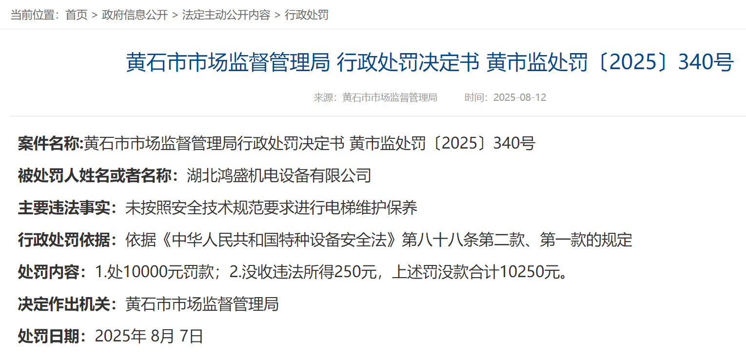 荊楚網(wǎng)(湖北日?qǐng)?bào)網(wǎng))訊(記者呂鑒蕾)8月12日,黃石市市場(chǎng)監(jiān)督管理局官網(wǎng)連發(fā)三條處罰公告,三家電梯維保公司被處罰。