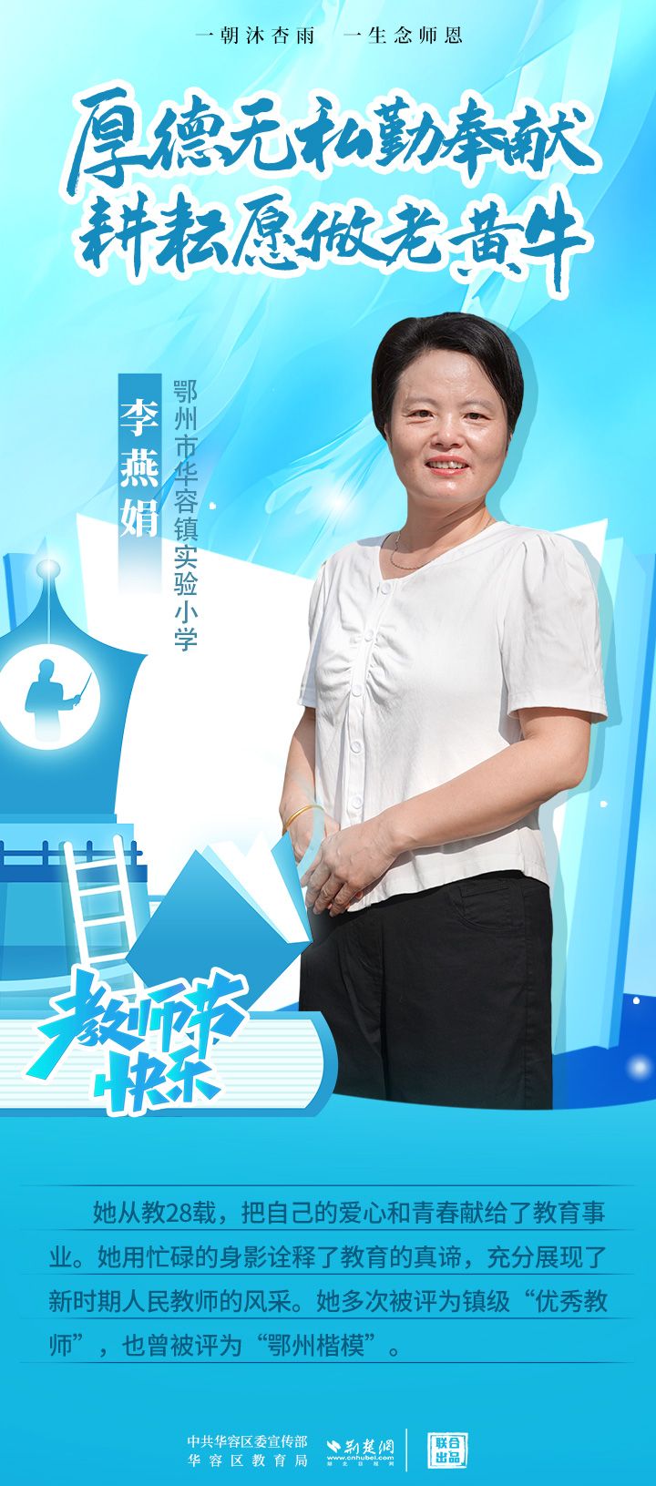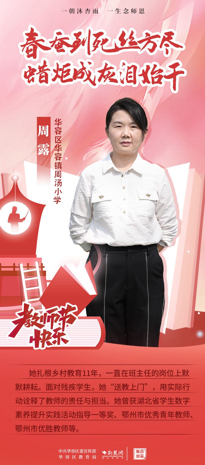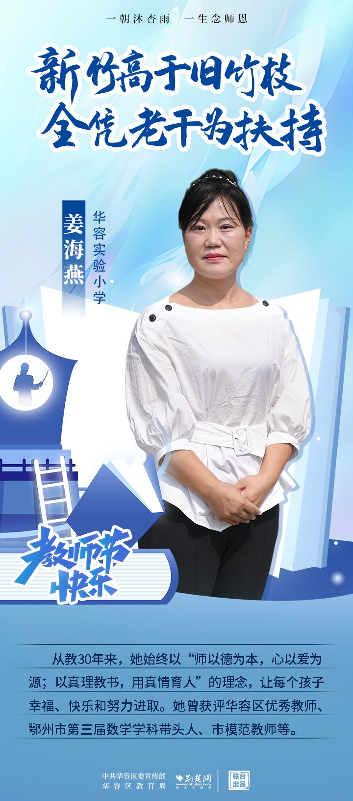 荊楚網(wǎng)(湖北日報網(wǎng))訊(記者 劉璐 通訊員 張曉琴)百年大計,教育為本;教育大計,教師為本。在教師節(jié)來臨之際,中共華容區(qū)委宣傳部聯(lián)合荊楚網(wǎng)(湖北日報網(wǎng))推出創(chuàng)意海報,姜海燕、廖進等6名老師入選“荊楚好老師”群星計劃。她們?彰顯了新時代教師的風(fēng)采,?為教育事業(yè)的發(fā)展貢獻了重要力量?,向了不起的她們致敬!
