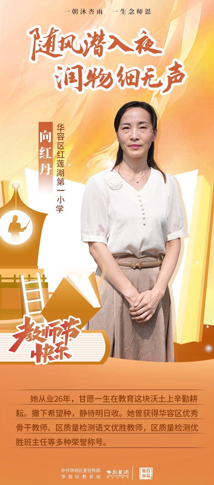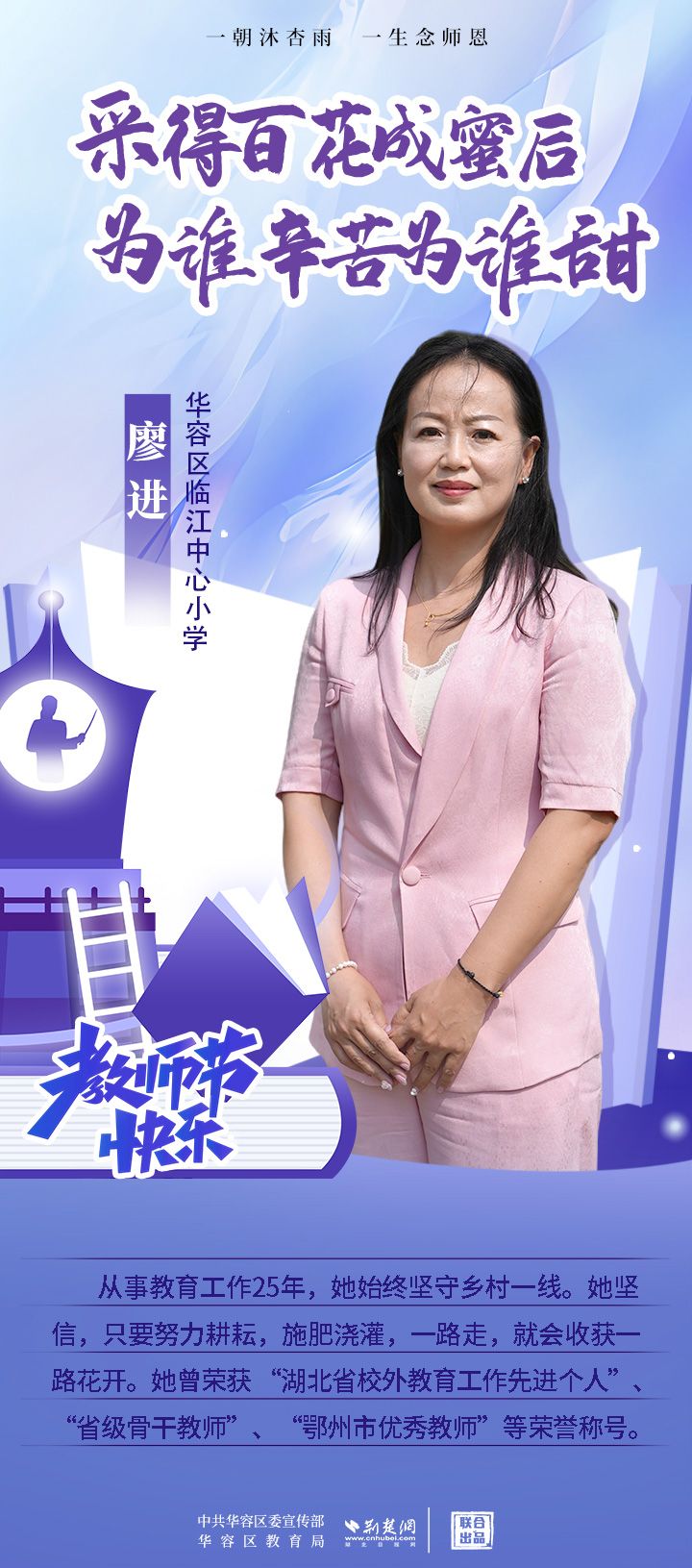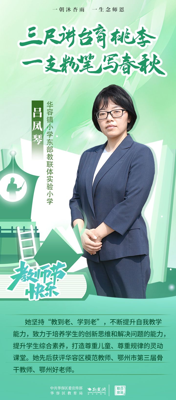 荊楚網(wǎng)(湖北日報網(wǎng))訊(記者 劉璐 通訊員 張曉琴)百年大計,教育為本;教育大計,教師為本。在教師節(jié)來臨之際,中共華容區(qū)委宣傳部聯(lián)合荊楚網(wǎng)(湖北日報網(wǎng))推出創(chuàng)意海報,姜海燕、廖進等6名老師入選“荊楚好老師”群星計劃。她們?彰顯了新時代教師的風(fēng)采,?為教育事業(yè)的發(fā)展貢獻了重要力量?,向了不起的她們致敬!