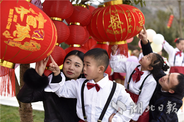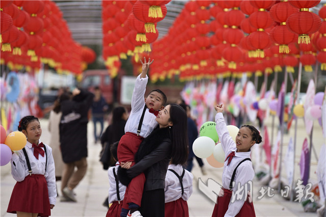 2019年2月2日,小朋友在通城縣塘湖鎮(zhèn)荻田村紅色廣場紅燈籠旁合影。當日,湖北省通城縣塘湖鎮(zhèn)荻田村在紅色廣場舉行花傘彩燈民俗節(jié)活動,以趕集逛廟會,舞龍、旗袍秀、跳廣場舞、觀花傘彩燈、草扎、鄉(xiāng)土美味等多彩民間活動展示美麗鄉(xiāng)村建設成果,在濃濃的年味中喜迎新春。(視界網劉建平攝)
