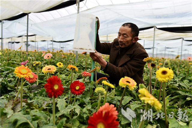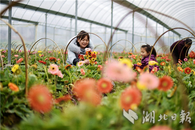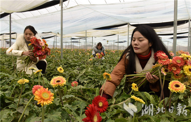 2月20日,湖北省通城縣石南鎮(zhèn)賽公村非洲菊種植專業(yè)合作社社員在采摘非洲菊供應市場。
