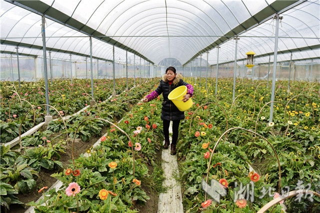 2月20日,通城縣石南鎮(zhèn)賽公村非洲菊種植專業(yè)合作社社員在采摘非洲菊供應市場。該基地是當地返鄉(xiāng)創(chuàng)業(yè)青年2016年底流轉100畝山地興建的,共有大棚90個,種植非洲菊近十個品種,可年產鮮花1000余萬棵,暢銷武漢、岳陽等周邊城市,畝純收入2萬元。(視界網劉建平攝)