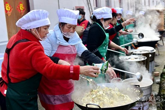 中午12時(shí),開席上菜。不少村民忙著籌備年豬宴,將成年豬宰殺后制作成各類美食。不多時(shí),一道道香氣十足的菜肴——粉蒸肉、農(nóng)家臘肉等十多個(gè)菜陸續(xù)端上餐桌。大家圍聚在一起共品美食,開懷暢飲,提前感受那份濃濃的年味兒。