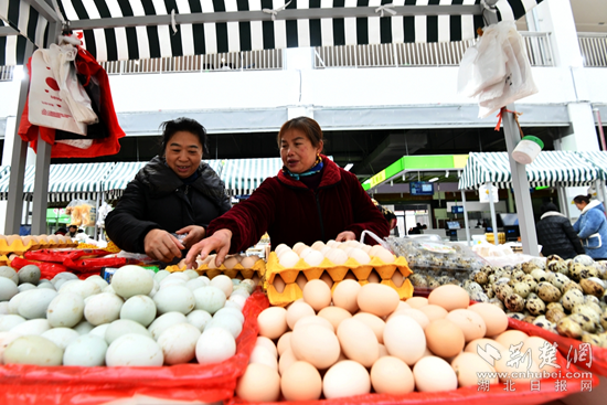 在肉類攤位前,剁了20多年肉砧板的胡金山割肉的手麻利多了——他邊賣肉,邊招呼顧客,今天喜遷新市場(chǎng),瞧這秤也足足的。排著長(zhǎng)隊(duì)購(gòu)買“兩頭烏”豬肉的顧客不時(shí)盯著屏幕上中央電視臺(tái)拍攝采訪這位養(yǎng)豬大戶的專題片,有的掃一掃二維碼,看養(yǎng)豬場(chǎng)實(shí)況。