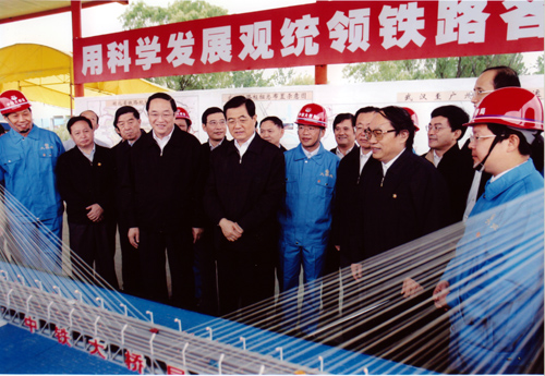 2005年8月22日上午,中共中央總書記、國(guó)家主席、中央軍委主席胡錦濤同隨行的中共中央政治局候補(bǔ)委員、中央書記處書記、中央辦公廳主任王剛,在中共中央政治局委員、湖北省委書記俞正聲,湖北省省長(zhǎng)羅清泉等陪同下,考察了正在建設(shè)中的武漢天興洲公鐵兩用長(zhǎng)江大橋工程,對(duì)鐵路建設(shè)作出重要指示。胡總書記指出,武廣鐵路客運(yùn)專線和武漢天興洲大橋是中國(guó)鐵路建設(shè)史上新的里程碑。這條鐵路線的建設(shè)標(biāo)志著中國(guó)鐵路客運(yùn)專線建設(shè)的開始,今后要建設(shè)更多的鐵路客運(yùn)專線。一定要把武廣客運(yùn)專線和天興洲大橋這個(gè)我國(guó)鐵路建設(shè)史上新的里程碑工程建設(shè)好。
