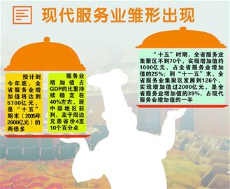 五年來(lái),全省不斷改造提升傳統(tǒng)服務(wù)業(yè),大力發(fā)展需求潛力大的現(xiàn)代服務(wù)業(yè),鞏固提高商貿(mào)等支柱服務(wù)業(yè)的整體規(guī)模和水平,實(shí)現(xiàn)了多個(gè)新興行業(yè)和關(guān)鍵領(lǐng)域的重點(diǎn)突破,基本形成了二、三產(chǎn)業(yè)共同拉動(dòng)經(jīng)濟(jì)又好又快增長(zhǎng)的格局。省發(fā)改委表示,下一個(gè)5年,我省將力爭(zhēng)形成物流、旅游、金融、文化、信息、中介6個(gè)增加值或收入過(guò)千億元的現(xiàn)代服務(wù)業(yè)產(chǎn)業(yè),力爭(zhēng)服務(wù)業(yè)增加值實(shí)現(xiàn)過(guò)萬(wàn)億元的突破,占全省GDP比重達(dá)到43%。
