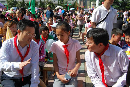 開幕式結(jié)束后,佩戴著少先隊員敬獻的紅領(lǐng)巾,周森鋒來到同學們中間,和大家一起唱誦國學經(jīng)典《鋤禾》、《弟子規(guī)》,觀看文藝節(jié)目,并親切地和身邊的小學生交談,詢問他們的家庭和學習情況,并希望他們積極參加社會實踐,鍛煉強健身體,增長才干。