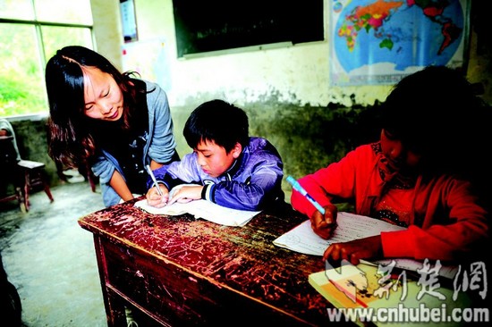 圖為:張春麗再次走進課堂,輔導孩子們語文。